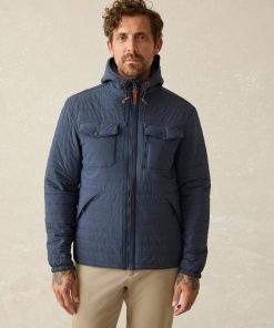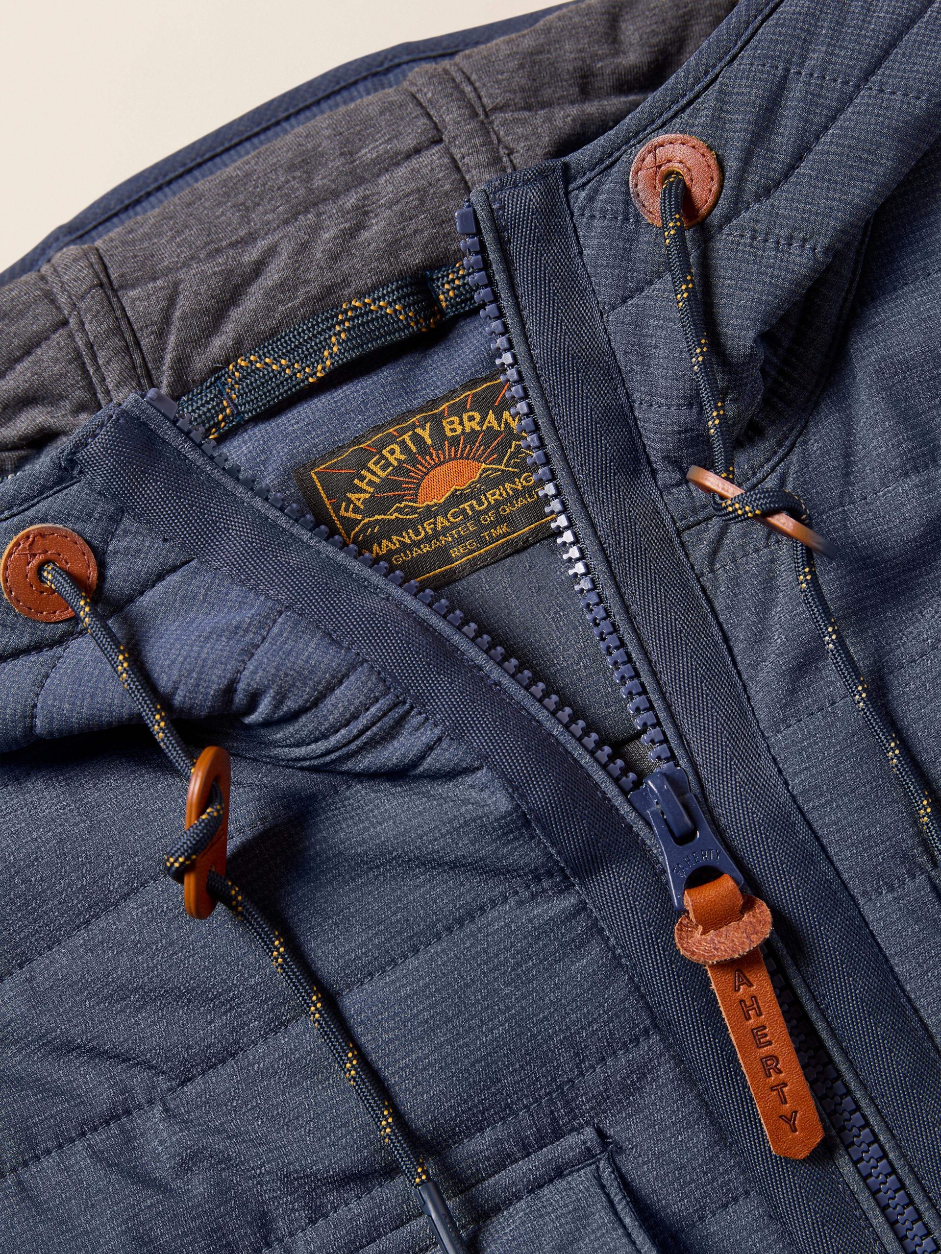 - Material: 65% Recycled Nylon, 22% Recycled Polyester, 13% Elastane; Lining: 75% Recycled Polyester, 19% Lyocell, 6% Elastane; Sleeve Lining: 91% Recycled Nylon, 9% Elastane; Insulation: 100% Recycled Polyester; Faherty MFG snaps; Herringbone tape