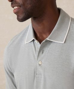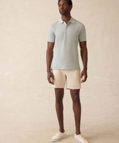 - Detail: Spread collar with built-in collar stays. Three-button placket. Short sleeves. Vented hem. Locker loop and half-moon at interior back neck. Sun & Waves label at wearer’s left hem.Flat knit collar with contrast tipping along edge. Three-button placket. Short sleeves. Vented hem. Locker loop and half-moon at interior back neck. Sun & Waves label at wearer’s left hem.