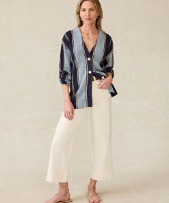 - Detail: Novelty striped cardigan. Button front closure with agoya buttons.