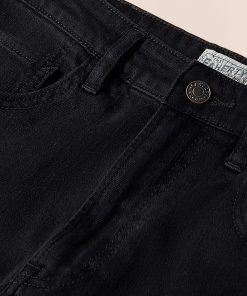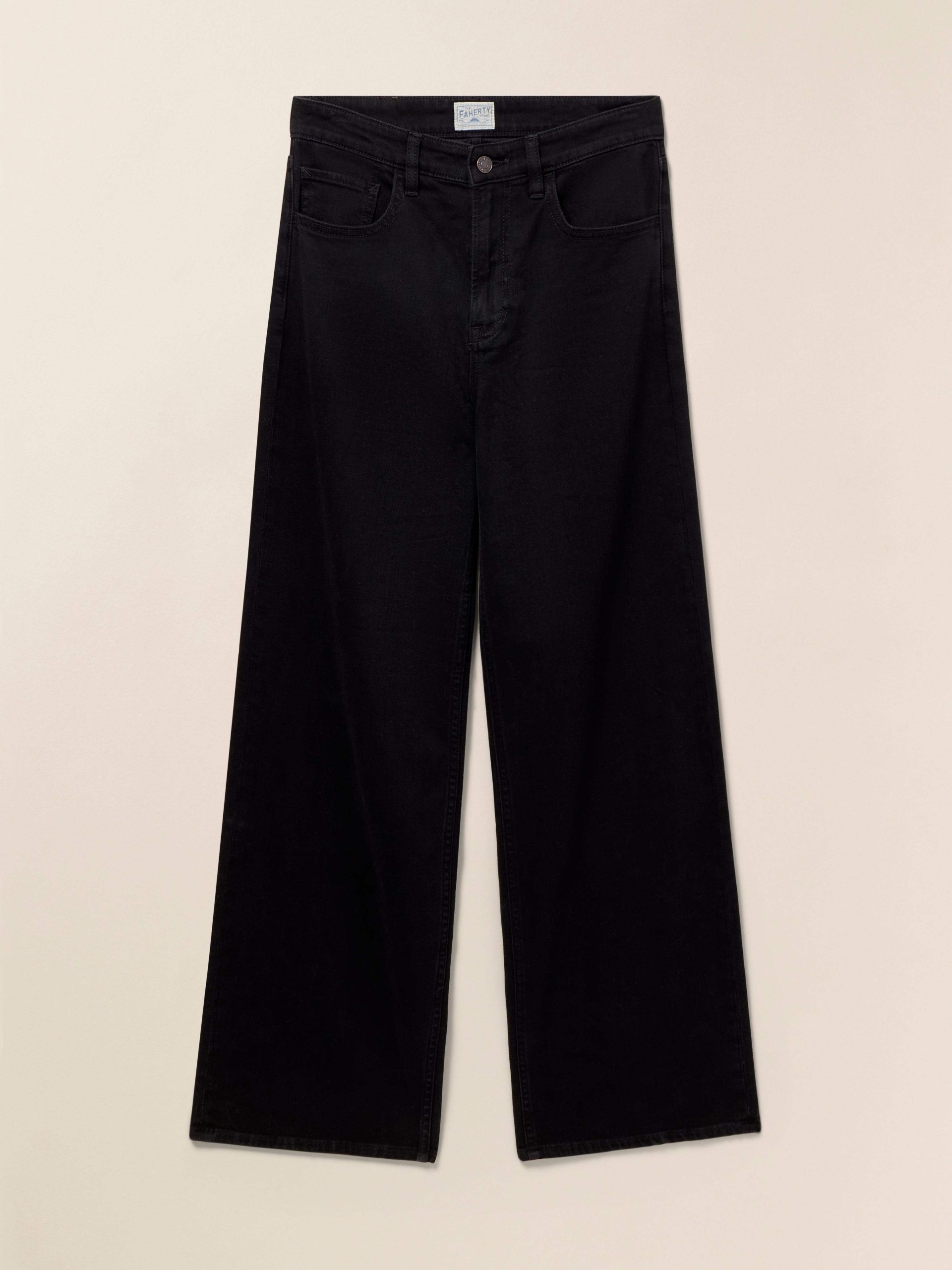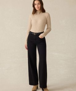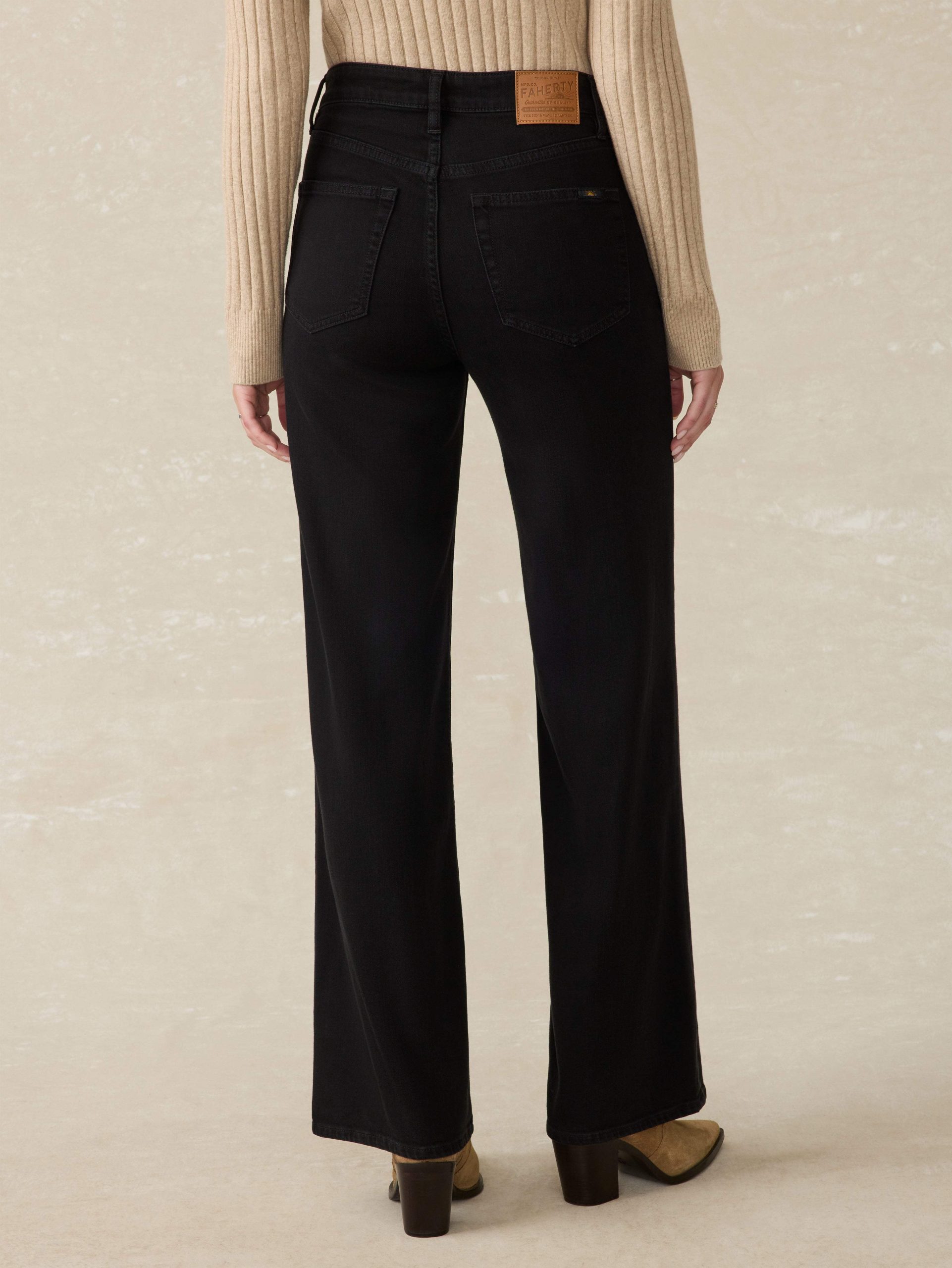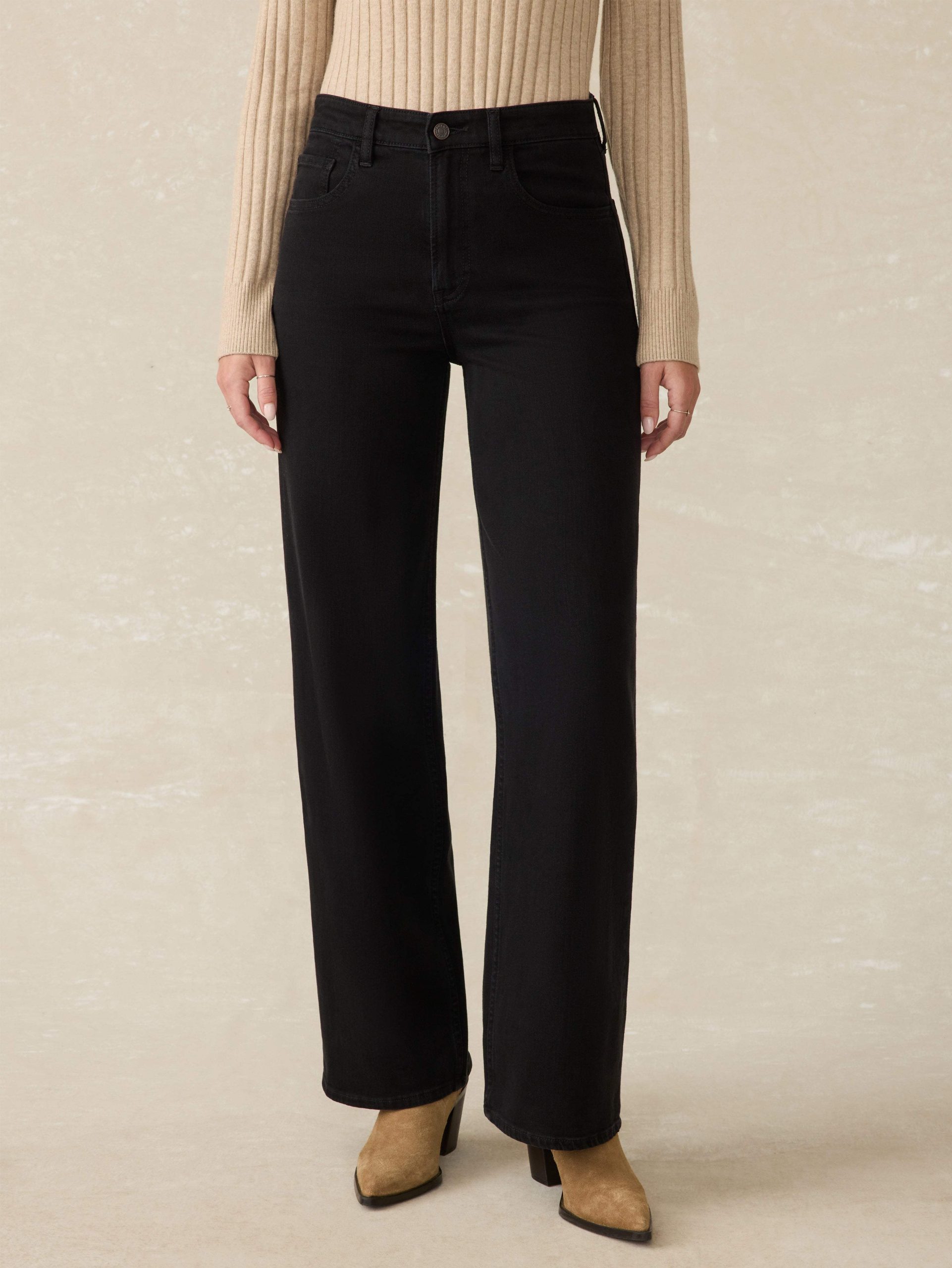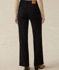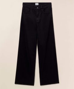 - Detail: Denim 5-pocket highrise wide-leg jean. Super soft, drapey, lightweight stretch denim fabric. Dark black wash.