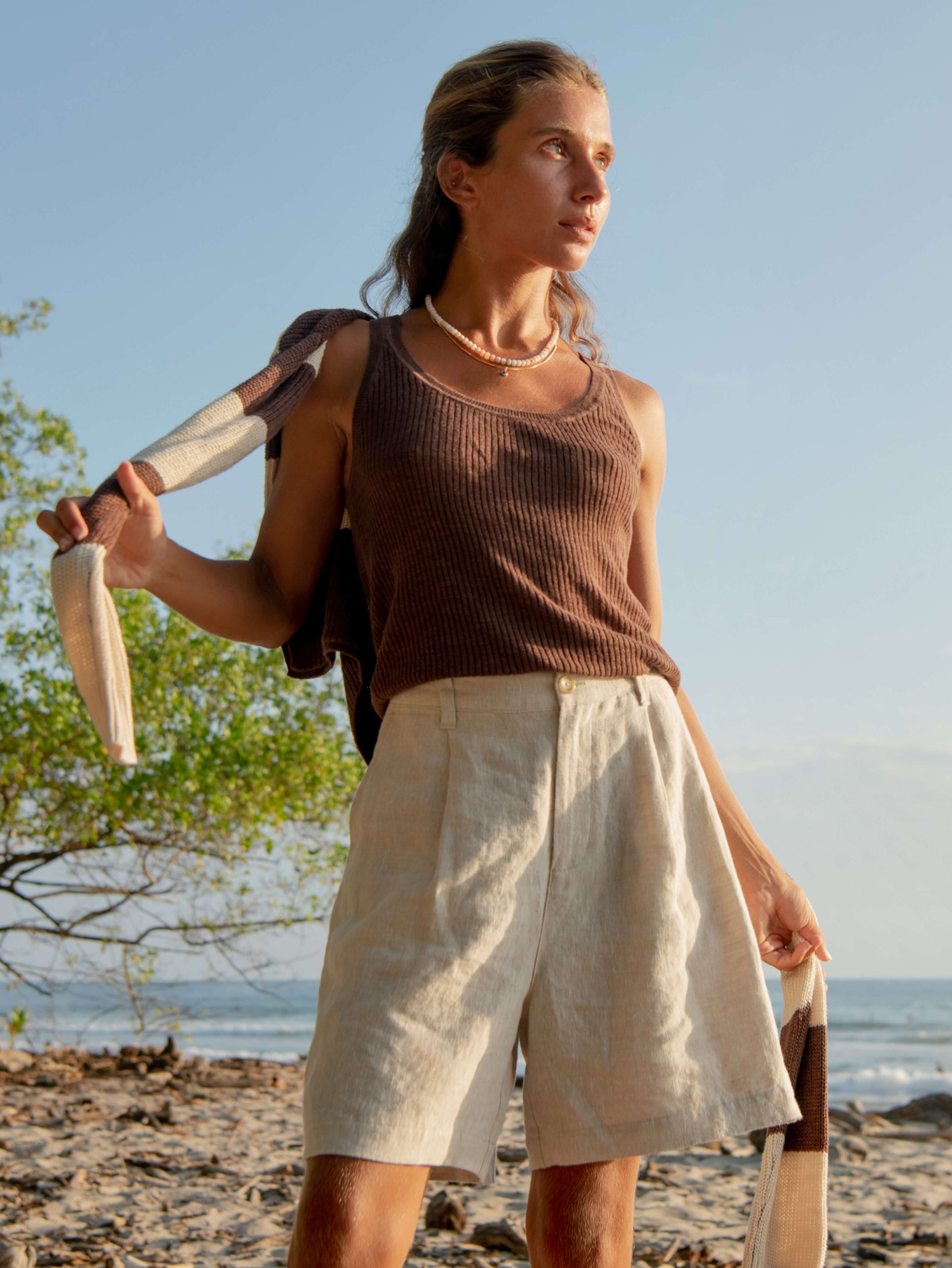 This fine-gauge ribbed tank is knit from a soft linen-cotton blend that breathes easy when the heat turns up. The close fit and refined texture give it a dressed-up edge—perfect on its own or layered under something breezy when the sun dips low.