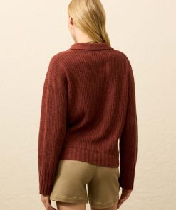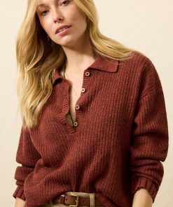 - Detail: Long sleeve polo sweater with rib stitch detail. Functional buttons at placket.