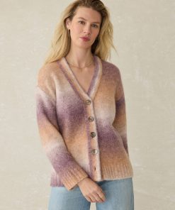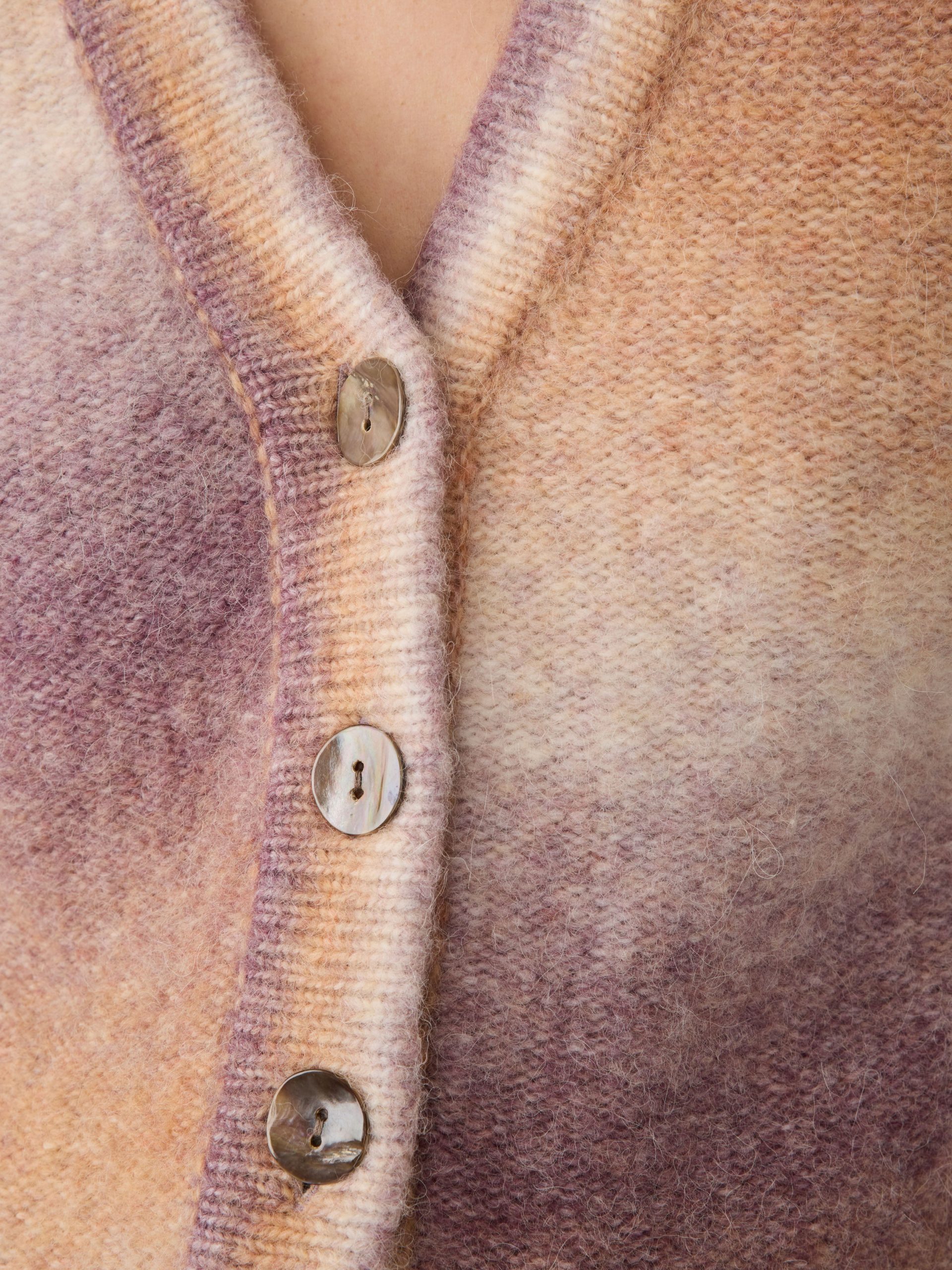 - Detail: Long sleeve cardigan with button front closure. Novelty space-dyed yarn. Mussel shell buttons. Rib trims at sleeve cuffs and bottom hem.