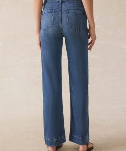 - Detail: Indigo stretch terry slim wide leg pants with patched front and back pockets. Regular stretch.