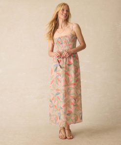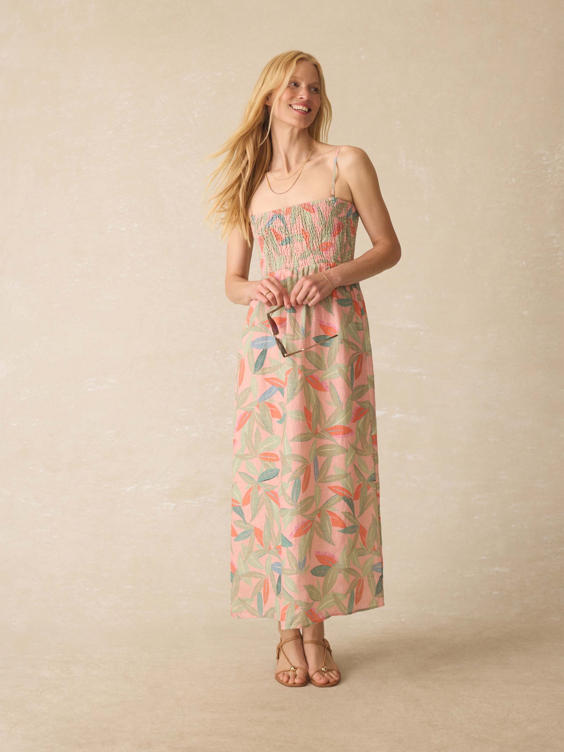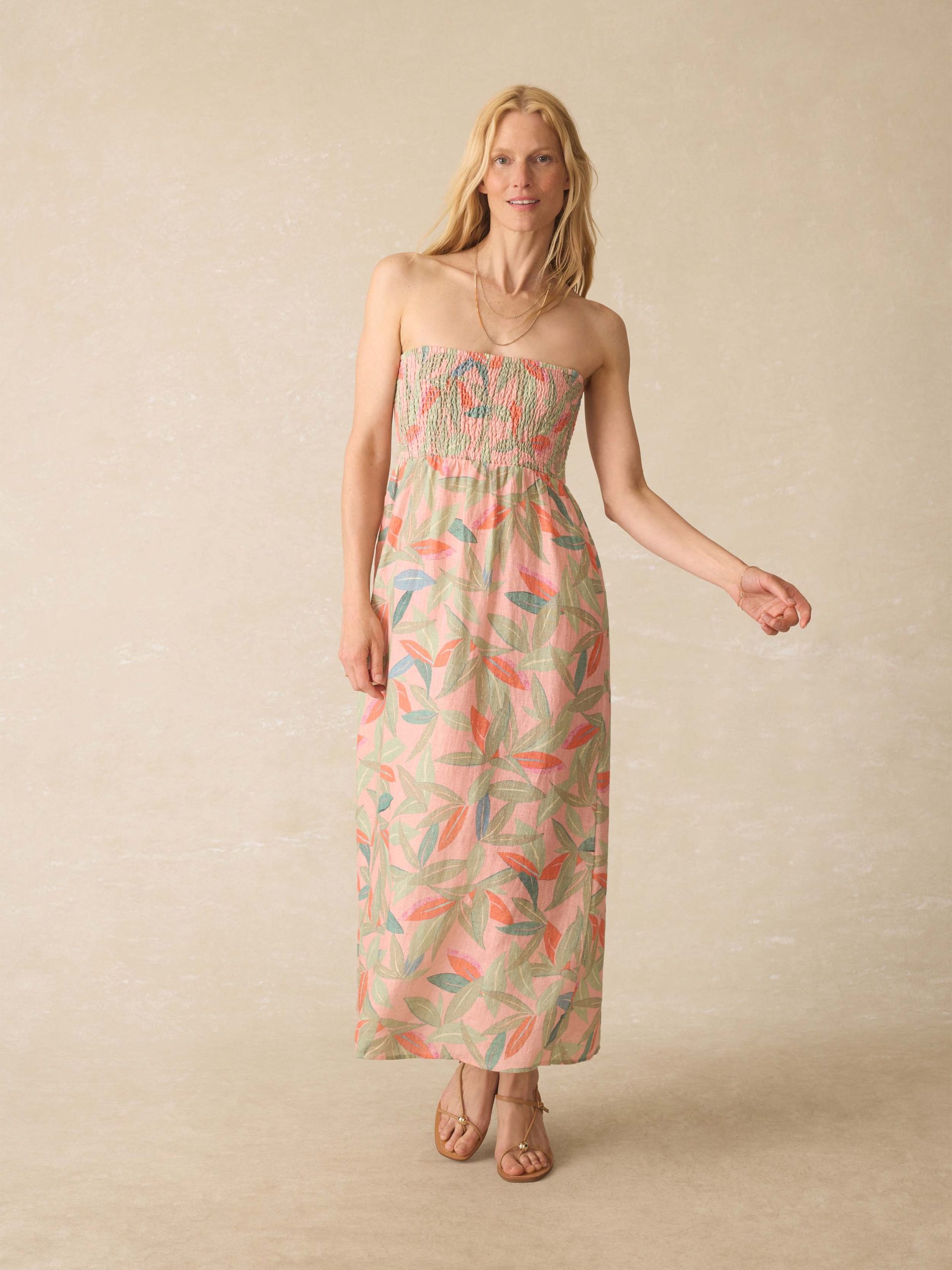 Our tropical midi dress is crafted from airy, textured linen that’s cool, breathable, and full of laid-back charm. The smocked bodice hugs comfortably with encased elastic at the top, while removable straps let you switch to sunkissed shoulders in a snap. Just add sandals and a salty breeze.