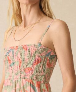 - Detail: Smocked bodice with encased elastic at top edge. Adjustable straps.