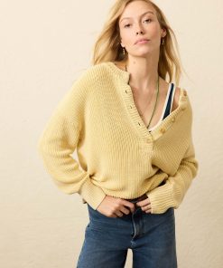 - Detail: Long sleeve, half cardigan stitch henley sweater. Rib trim details at neckline, placket, sleeve cuffs, and bottom hem. Functional buttons at placket.