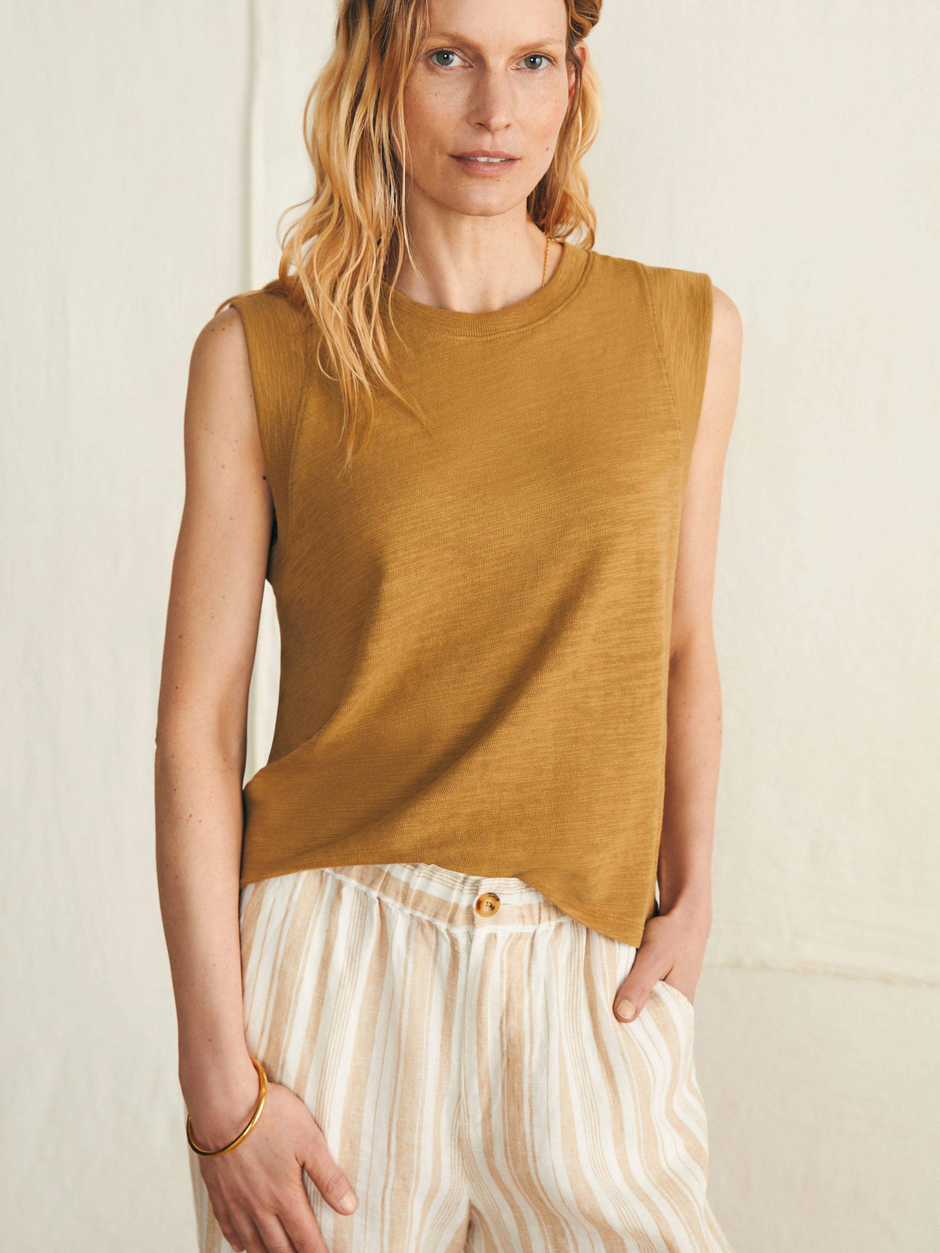 We consider the muscle tank one of summer’s essential tops. In our perfectly faded sunwashed treatment, it strikes a nonchalant and lived-in cool that never goes out of style. The slightly cropped and breezy fit pairs perfectly with any summer short or skirt.