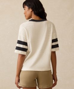 - Detail: V-Neck tee with contrast piecing details at neckline and sleeves. Clip label at bottom hem.