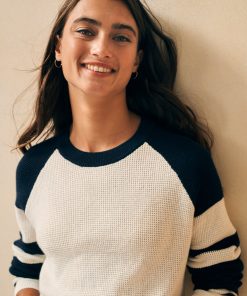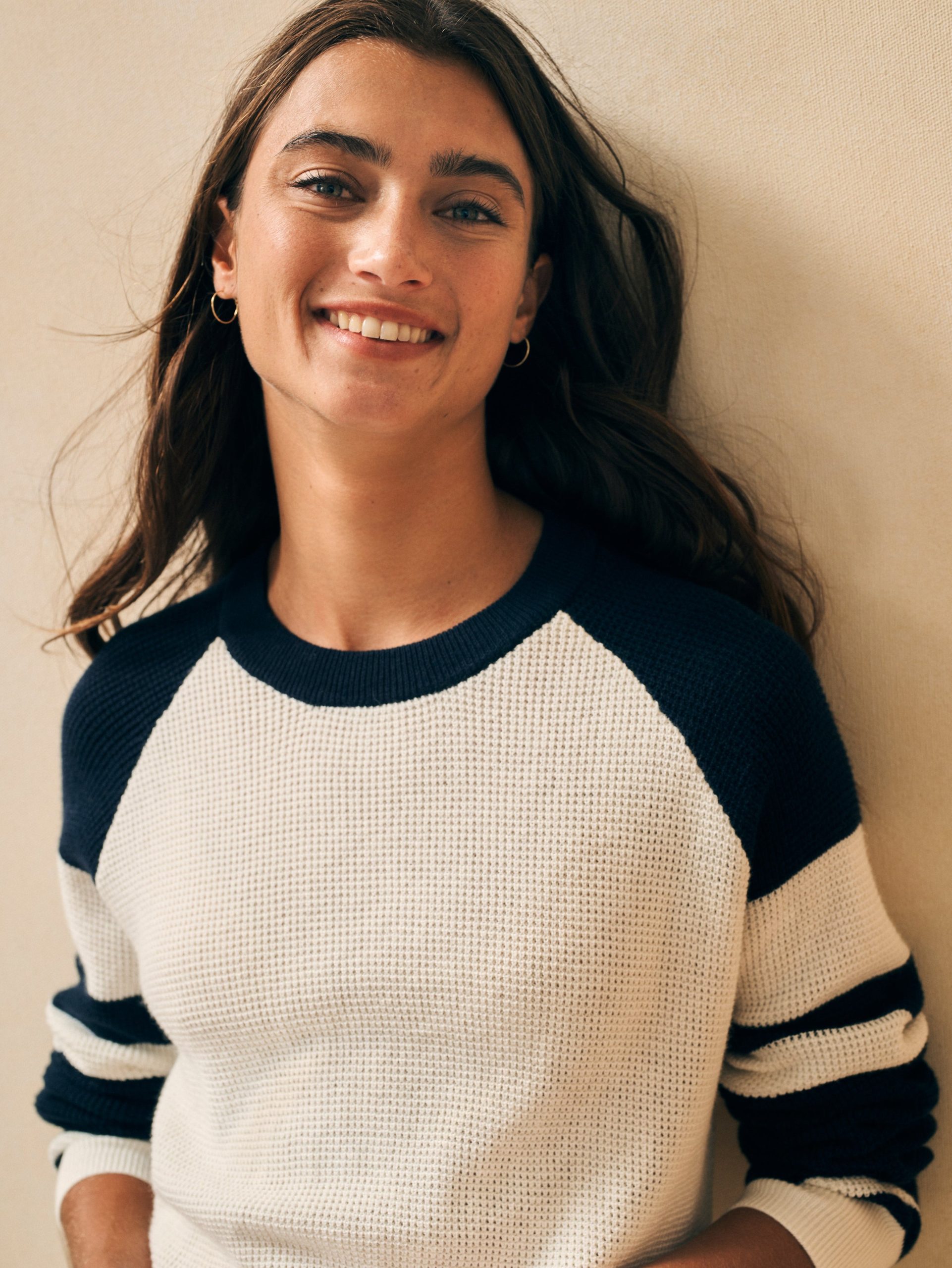 With a nod to nostalgic collegiate sportswear, this classic crewneck gets an elevated update in the softest organic cotton and cashmere yarn. The wonderfully textured waffle stitch lays with a relaxed, no-fuss fit that keeps you toasty and comfy. Play up the sporty stripes and playful color blocking with jeans or a corduroy skirt for a quintessential fall look.